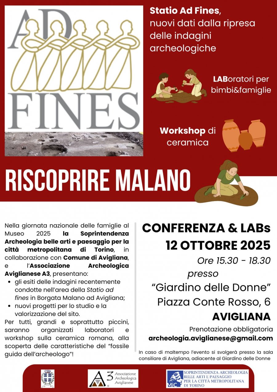 In occasione della giornata nazionale delle famiglie al Museo 2025 la Soprintendenza Archeologia belle arti e paesaggio per la città metropolitana di Torino, in collaborazione con il Comune di Avigliana, l’Associazione Archeologica Aviglianese A3, organizza un pomeriggio all’insegna dell’archeologia. Con l’occasione saranno presentati al pubblico gli esiti delle indagini recentemente condotte nell’area della Statio ad fines di Malano e saranno illustrati i nuovi progetti per lo studio e la valorizzazione del sito. La conferenza vedrà il coinvolgimento del personale della Soprintendenza e degli archeologici impegnati nel cantiere di scavo.